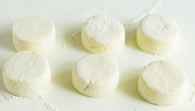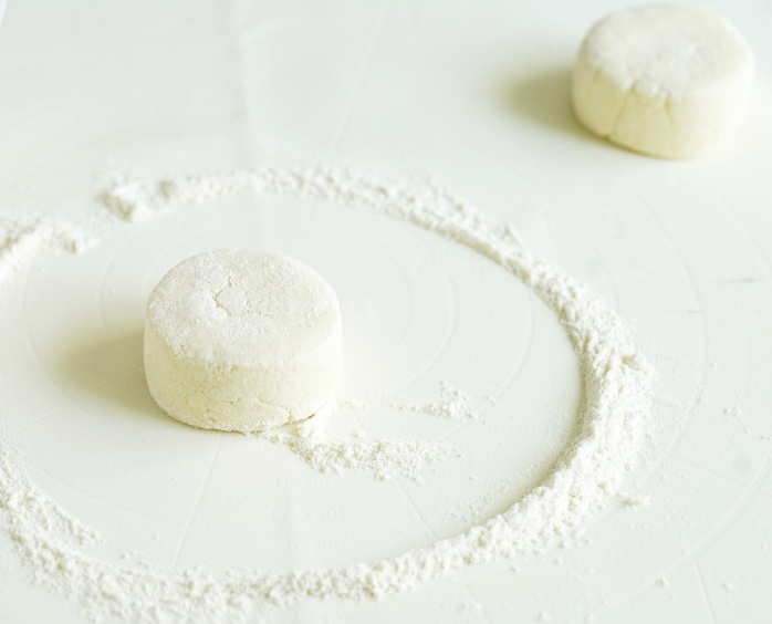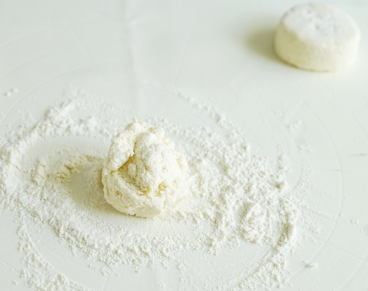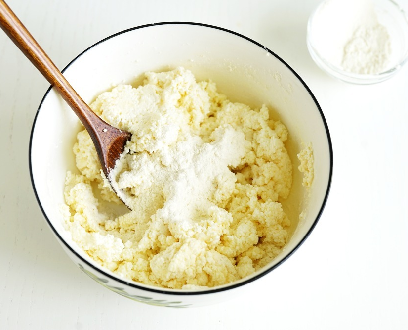 คลุกลูกแป้งคอทเทจชีสให้ทั่วด้วยแป้งสาลี จากนั้นวางถ้วยหรือแก้วไว้ด้านบนแล้วหมุนให้เร็ว ๆ