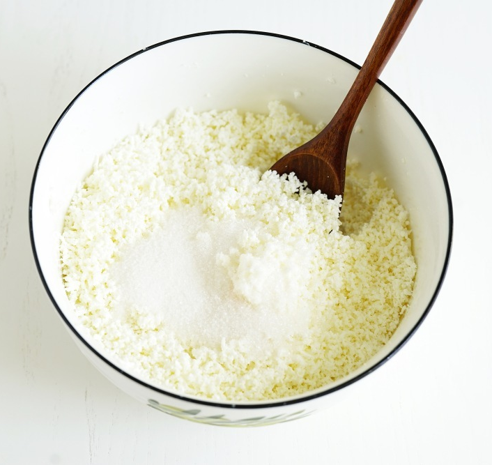 เตรียมคอทเทจชีส (ทวารอก) สำหรับทำชีสแพนเค้กแบบโฮมเมด.ใส่น้ำตาล เกลือ และน้ำตาลวานิลลาลงในคอทเทจชีส แล้วผสมทุกอย่างให้เข้ากันดี