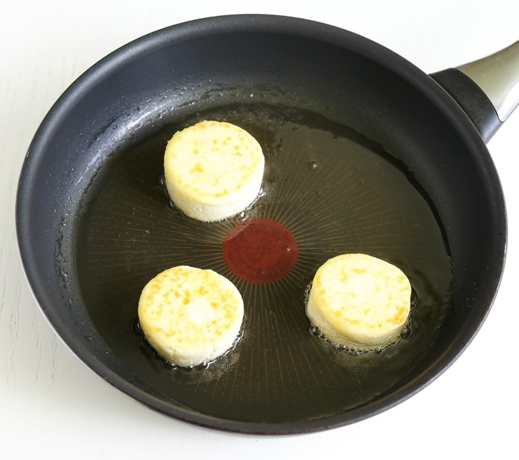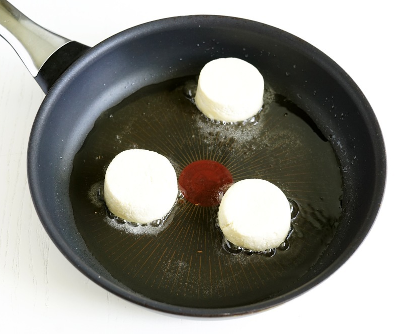 ใส่ชีสแพนเค้กคอทเทจที่ปั้นไว้ลงในกระทะน้ำมันร้อน